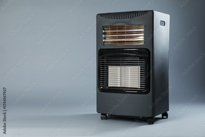 One electric heater on grey background. Space for text
