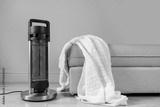 Electric heater and pouf with blanket on light wooden floor near grey wall indoors