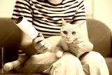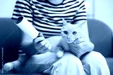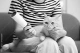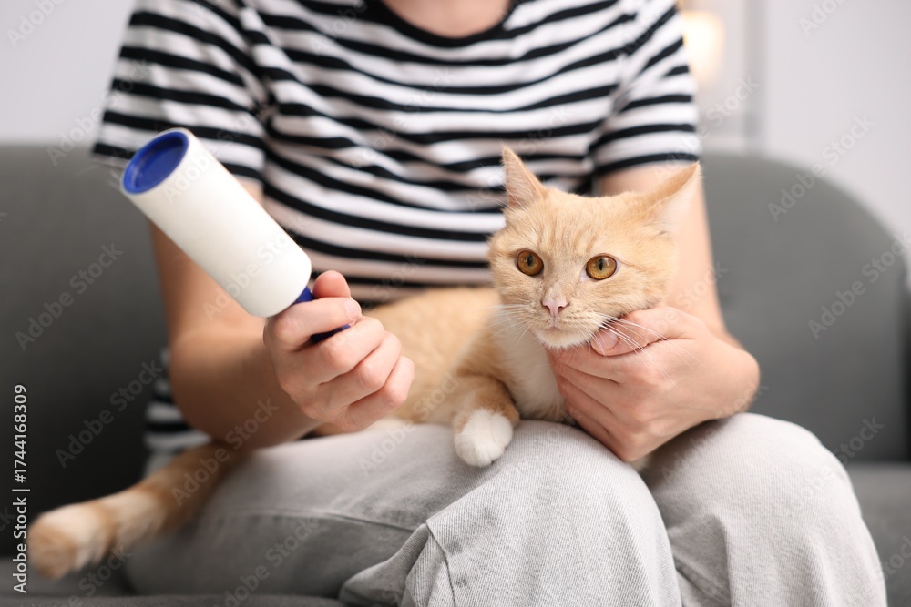 Woman with lint roller and her cat on sofa at home, closeup