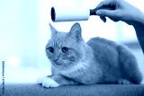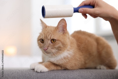 Woman rubbing down her cat with lint roller on sofa at home, closeup