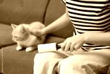 Woman with lint roller removing pet's hair from pants and stroking her cat on sofa, closeup