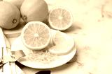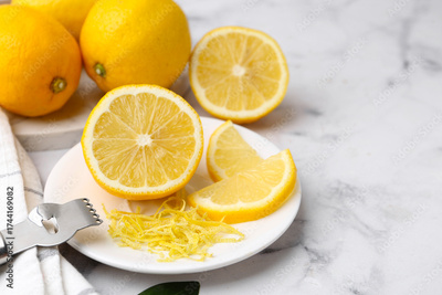 Lemon zest, fresh fruits and zester tool on light marble table, closeup