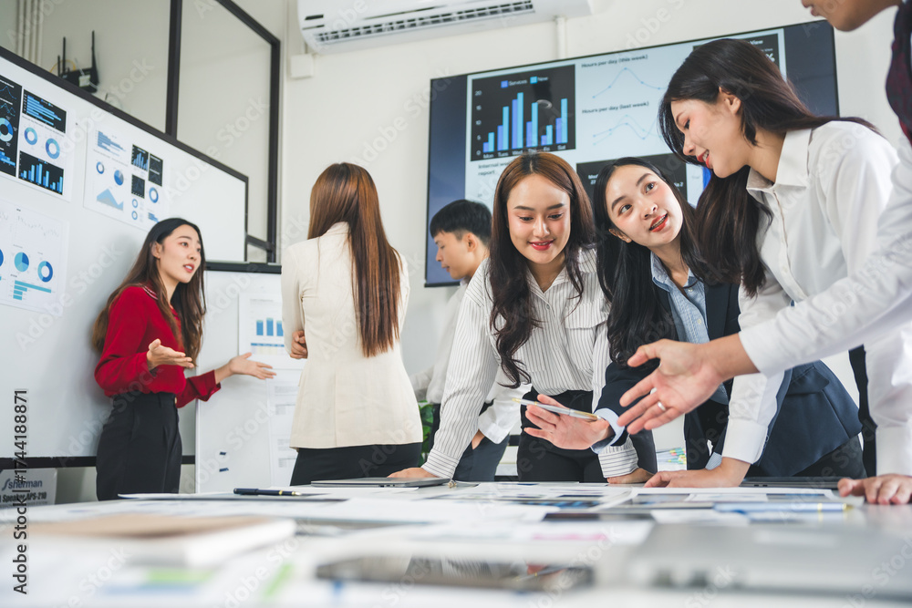 Group of young asian businesswomen discussing new business projects during a meeting in a modern office
