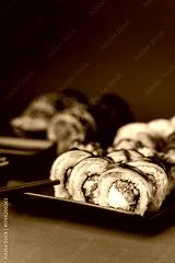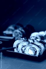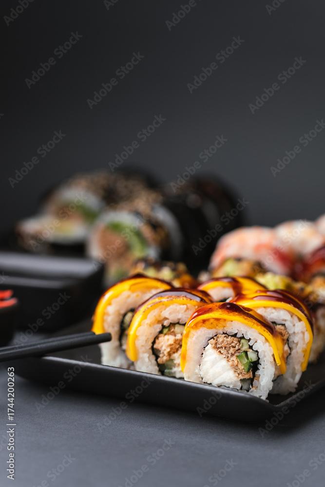Sushi roll with salmon, avocado and tuna. Sushi set served on the black plate next to red ginger with black sticks on the black background