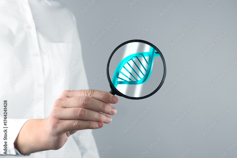 Scientist holding magnifying glass with DNA spiral inside against grey background, closeup. Genetic analysis and research