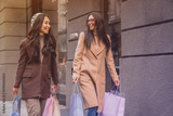 Two young women girlfriends with shopping bags walking along the city street after buying purchasing clothes gifts presents for holidays Christmas . Black friday, huge discounts sales.