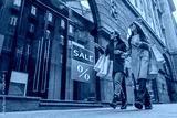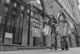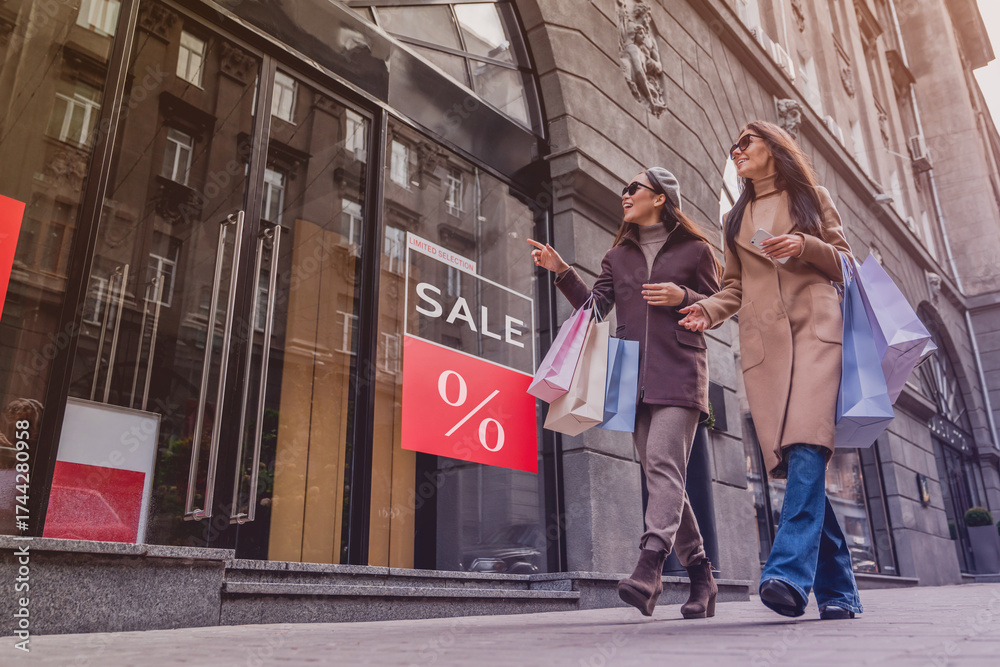 Women buying holiday presents walking with shopping bag near Sale sign on shop showcase.