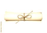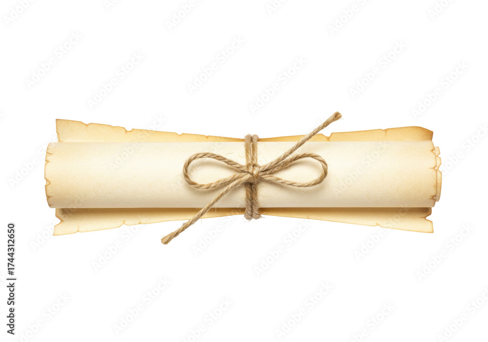 Aged paper scroll tied with twine isolated on transparent PNG, vintage parchment document for antique maps and treasure hunt clues