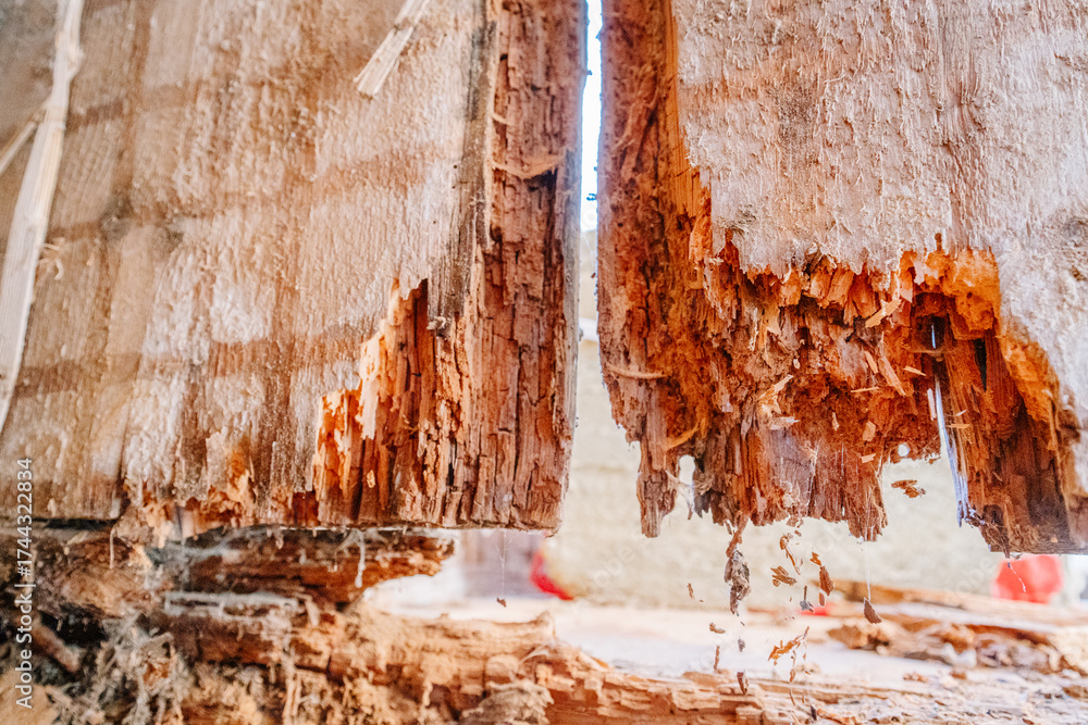 Close-up of severely rotted wood splitting apart, with loose splinters and signs of insect or moisture damage visible in a deteriorated building structure.
