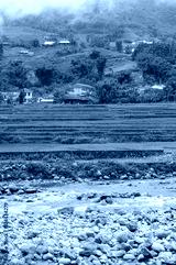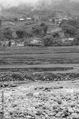 Countryside landscape with rice terraces, river and village