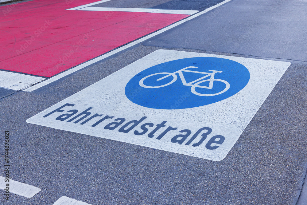 Fahrradstraße mit der Abbildung des entsprechenden Verkehrszeichens auf dem Asphalt