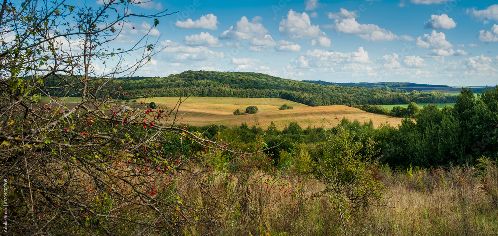 Panorama of fields, dry autumn herbs, forests under a bright blue sky with clouds