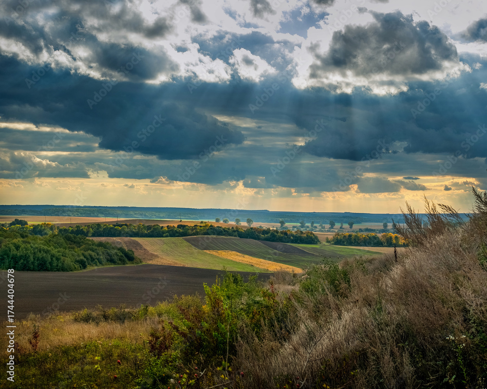 Landscape with fields on the horizon, sun rays through dramatic clouds