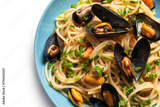 Spaghetti con cozze e prezzemolo, pasta italiana