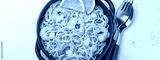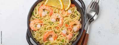 Shrimps pasta spaghetti served in a black cast iron skillet garnished with fresh lemon slices and parsley top view on white rustic background