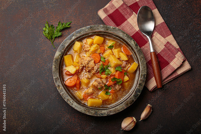 Hot chicken stew or soup with tender chicken pieces, chunky potatoes, and vibrant carrots garnished with fresh parsley in rustic bowl, comfort food for autumn and winter