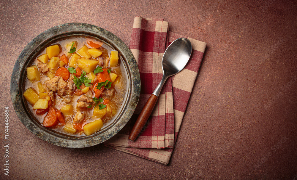 Hot chicken stew or soup with tender chicken pieces, chunky potatoes, and vibrant carrots garnished with fresh parsley in rustic bowl, comfort food for autumn and winter, copy space