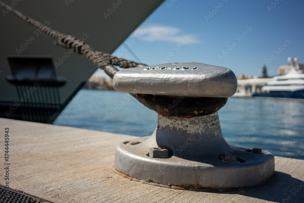Close-up of metallic mooring bollard with thick rope securing a yacht at the marina, sunlight reflections on metal and calm blue water in background