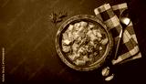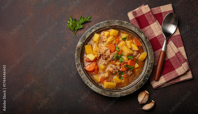 Hot chicken stew or soup with tender chicken pieces, chunky potatoes, and vibrant carrots garnished with fresh parsley in rustic bowl, comfort food for autumn and winter, copy space