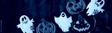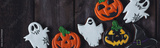 Banner. Assortment of Halloween gingerbread cookies with spiders, ghosts, jack-o-lantern on dark wooden background. Delicious homemade treat for kid's holiday party, sweet gourmet snack