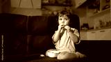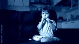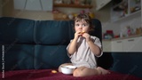little child resting at home. happy and full of joy childhood, children's dream concept. a small girl are sitting on a blue sofa attentively watching cartoons on TV lifestyle and eat apples
