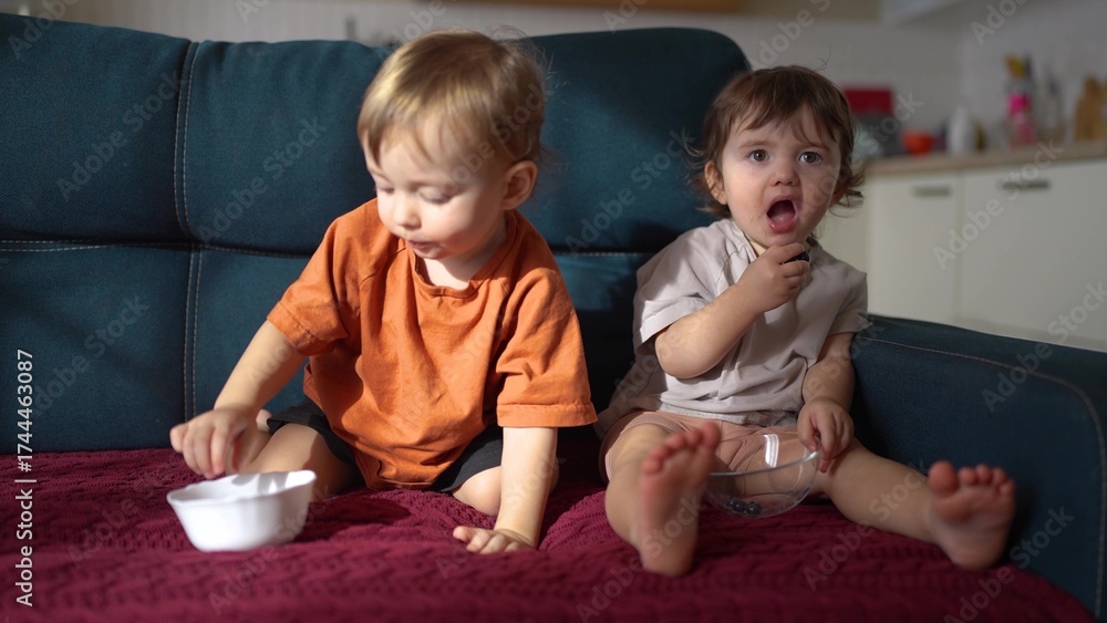 little children resting at home. happy and full of joy childhood, children's dream concept. a small boy and girl lifestyle are sitting on a blue sofa attentively watching TV and eat berries