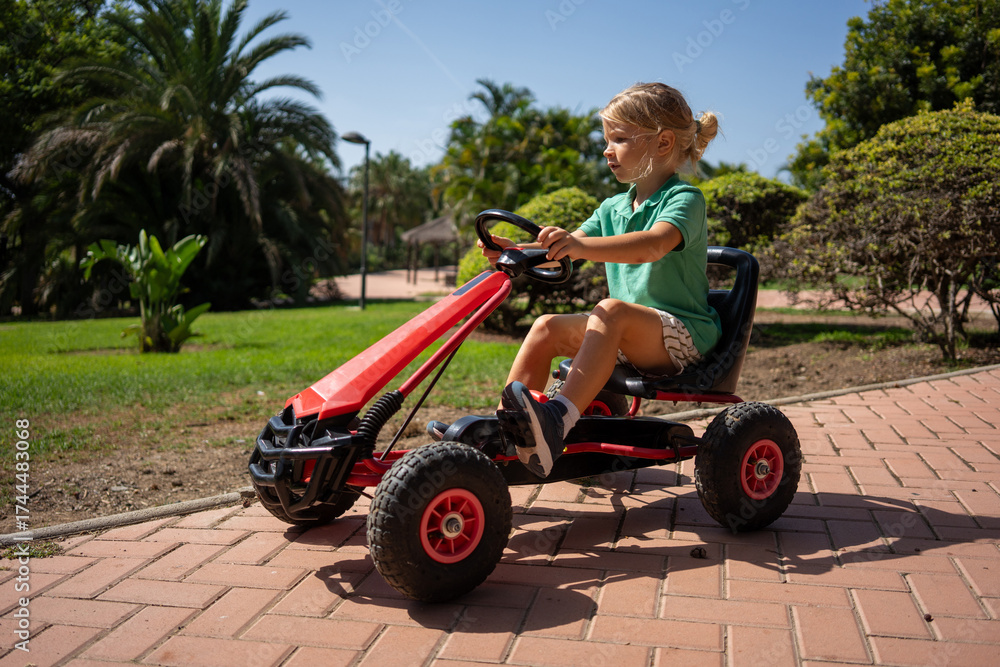 Little blond boy riding red pedal go-kart on sunny day in tropical park with palm trees, enjoying outdoor playtime, adventure and childhood fun