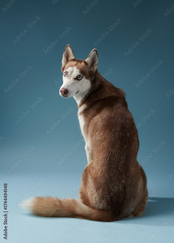 A Siberian Husky sits with its back turned, slightly glancing over its shoulder. The elegant pose and cool-toned backdrop highlight the breed's graceful posture.