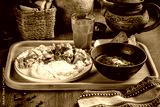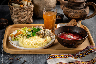 Traditional Ukrainian lunch with borscht and mashed potatoes served on a wooden tray