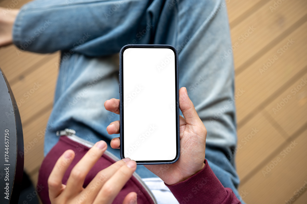 A man holding and touching on blank screen smartphone while sitting at table in cafe or coffee shop.