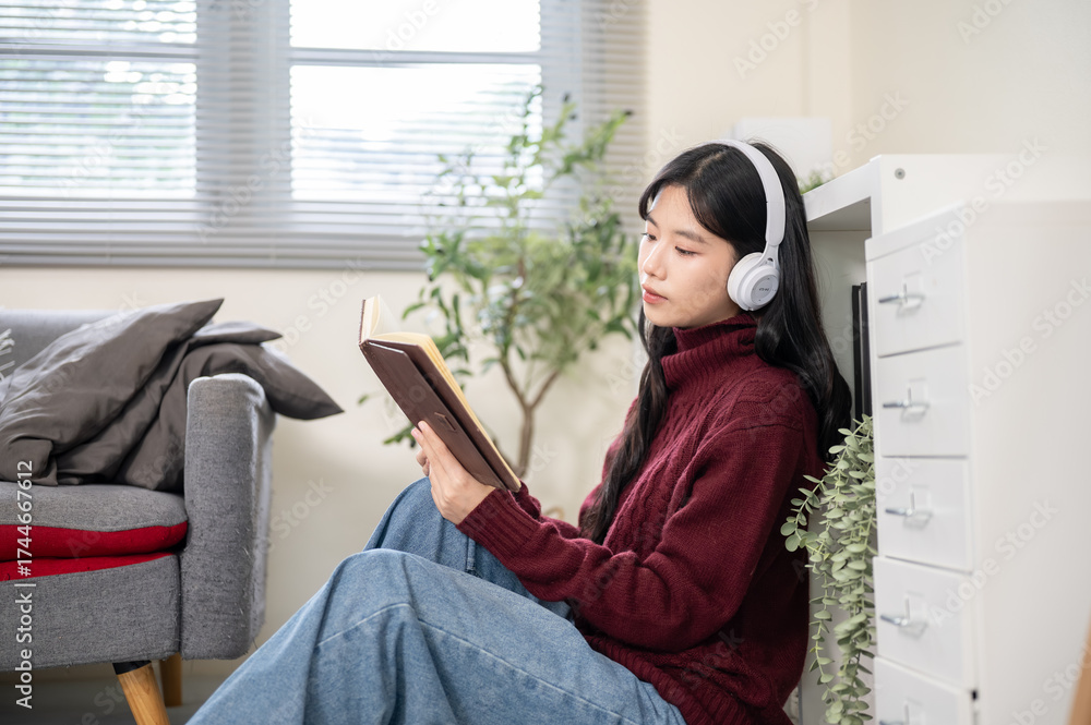 Pretty asian woman wearing headphones reading book while sitting on floor aside sofa in living room.