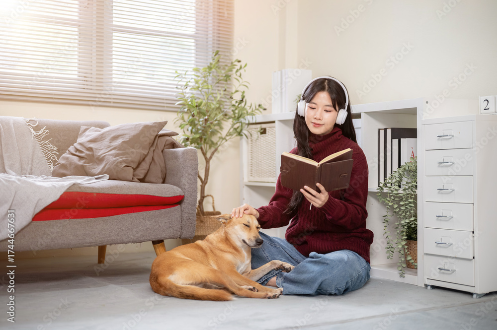 Pretty asian woman with headphones patting pet dog while reading book on floor carpet in living room