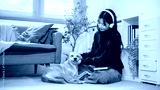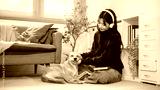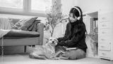 Pretty asian woman with headphones caressing pet dog while sitting on floor carpet in a living room.
