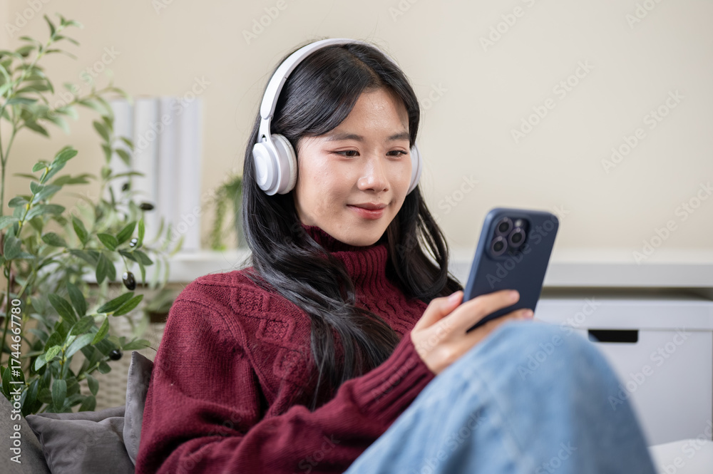 Close up of asian woman wearings headphones looking at phone while sitting on sofa in a living room.