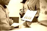 Close up businesswoman holding pen pointing at clipboard showing to man coworker at table in office.