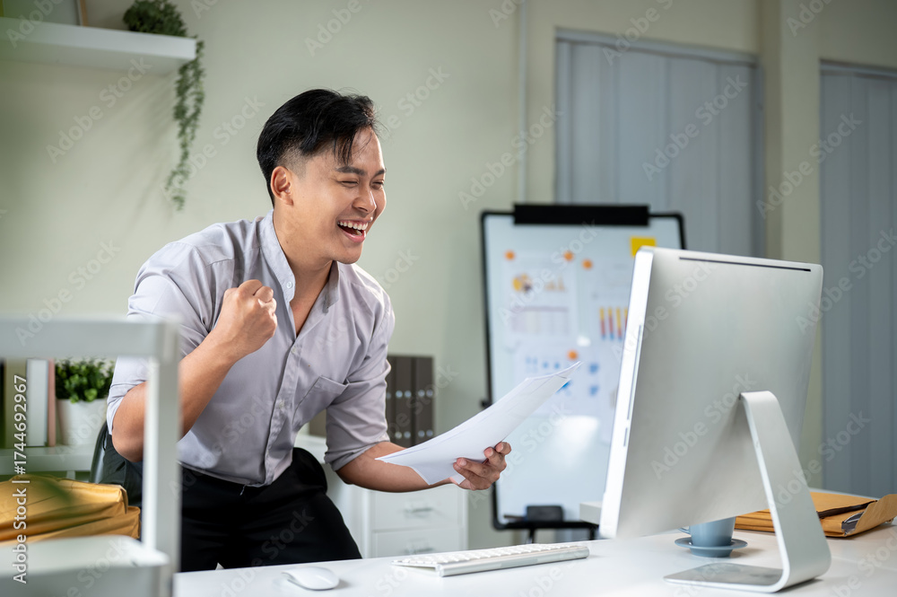 Asian businessman office worker holding paper looking at computer and making a fist at working table