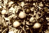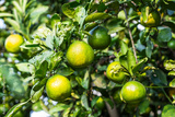 Green citrus fruits are seen hanging on a tree branch with lush green leaves, indicating a healthy fruit growth.