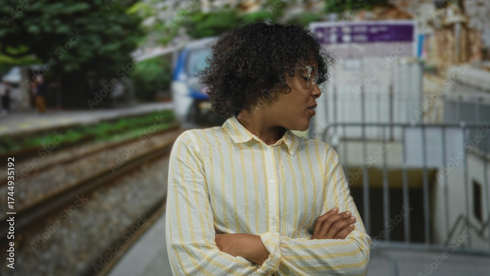 Woman points finger to approaching train beside modern station building; journey planning anticipation.