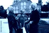 Group of two senior Caucasian women and one man standing outdoors smiling and talking, holding shopping bags, engaging in friendly conversation near bench in urban setting