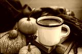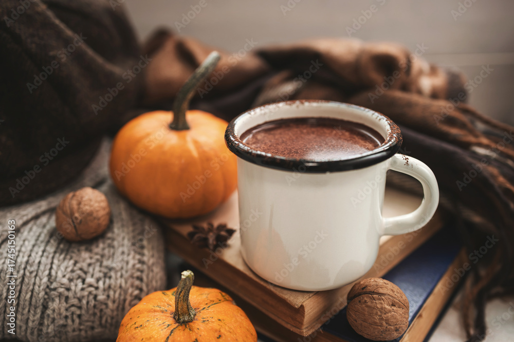 Cozy autumn still life with enamel mug of hot chocolate, pumpkins, vintage books, walnuts, cinnamon sticks, star anise and warm fall clothing, seasonal composition