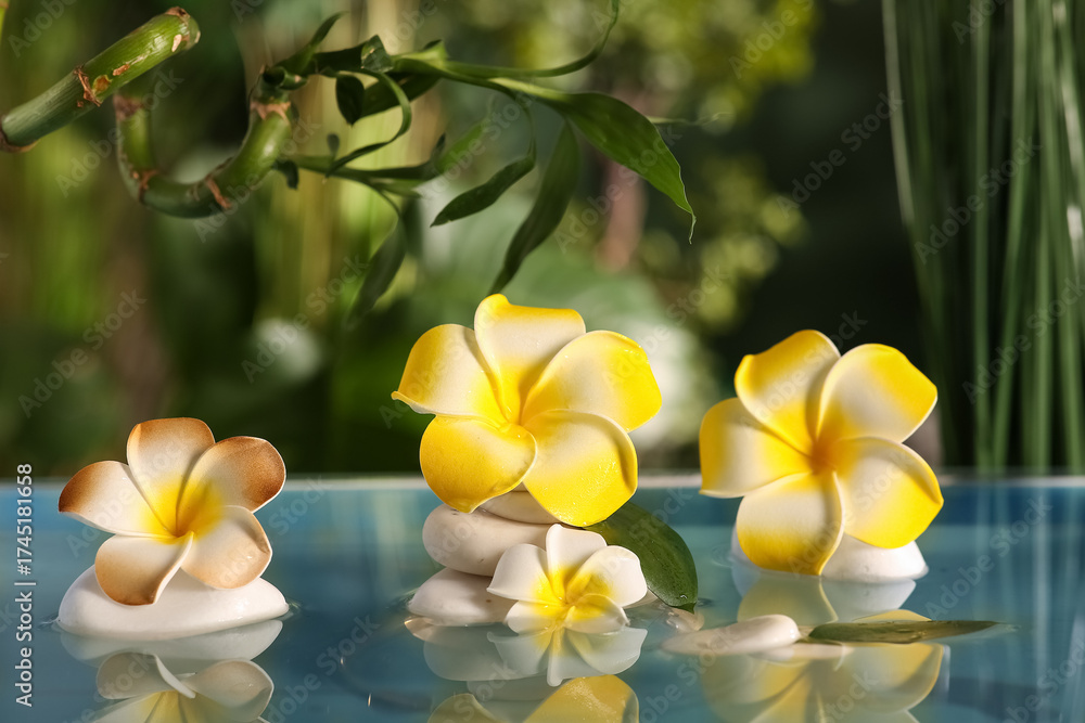 Lake with spa stones and beautiful plumeria flowers in tropical bamboo garden