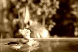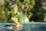 Lake with spa stones and beautiful plumeria flowers in tropical bamboo garden