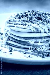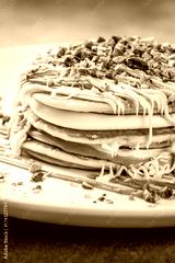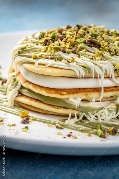 Pistachio pancakes with white chocolate and cream layers
