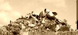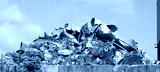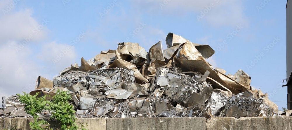 Large stack of aluminum and metallic material scraps in the outdoor storage of the metal recycling plant
