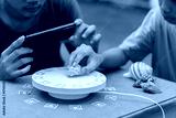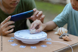 A seashell is carefully placed onto a 3D scanning platform marked with arUco codes as a smartphone is prepared to capture the object.