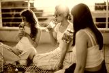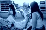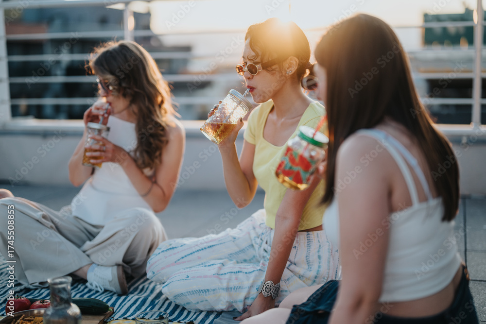 Three friends are seated on a rooftop enjoying refreshing drinks together as the sun sets, creating a warm and friendly atmosphere that reflects togetherness, relaxation, and urban lifestyle.