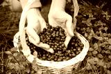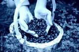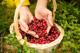 Close up of woman hand above basket filled with fresh cranberries in forest. Autumn berry harvest, natural vitamins, forest gifts, healthy food, outdoor walk with benefit, cranberry picking time.