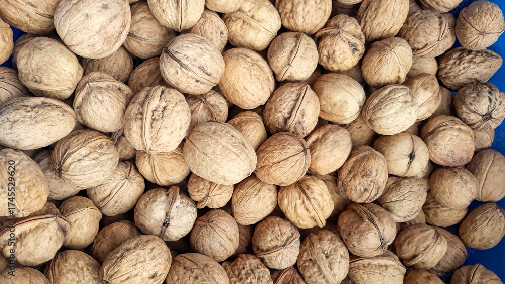 close-up of Cracked walnuts on a background covered with walnuts. Walnuts kernels on pattern Background With clipping path.