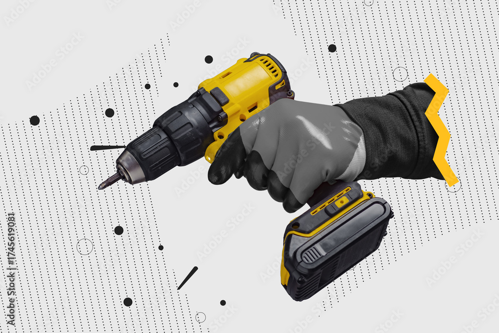 Pop art collage showing a worker hand in protective gloves holding a yellow cordless drill on a white abstract background. Concept of construction work, renovation, DIY and industrial tools.