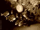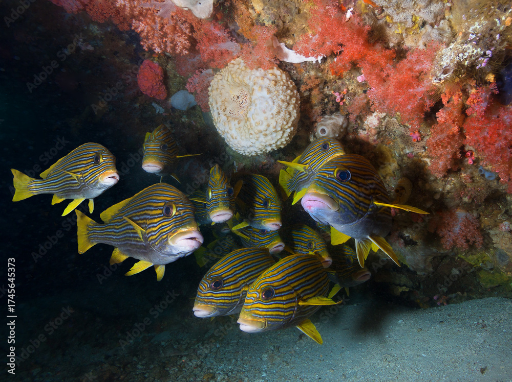 Shool of Ribbon sweetlips by coral reef.
